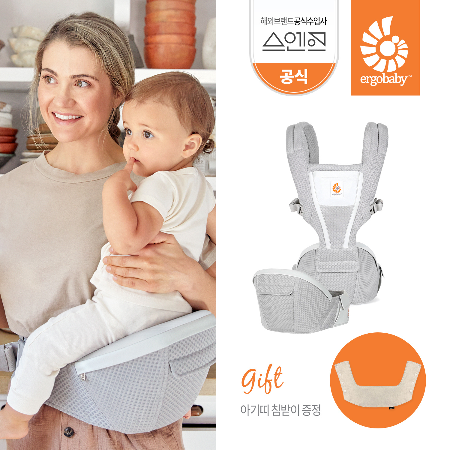 허리에 고정된 시트. 빠른 탈착·앉히기. 4개월+. 이미 걷는 아이 자주 안을 때 유용.